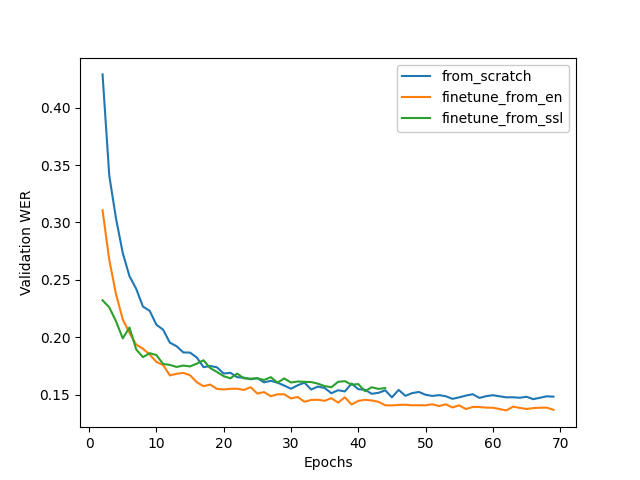 The figure below compares the training dynamics for three Conformer-Transducer models. They differ only by how they are initialized. We see that finetuning leads to faster convergence and better quality. Initializing from SSL gives lowest WER at earlier stages, but in a longer period it performs worse.