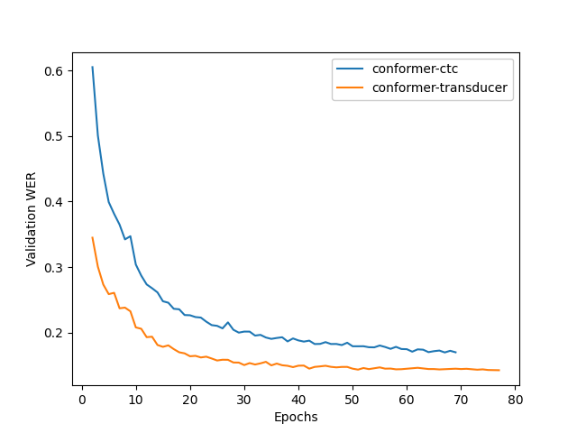 The figure below shows the training dynamics when we train Kinyarwanda models from scratch. In these experiments we used the hyperparameters from the default configs, the training was run on 2 nodes with 16 gpus per node, training batch size was 32. We see that Transducer model achieves better quality than CTC.